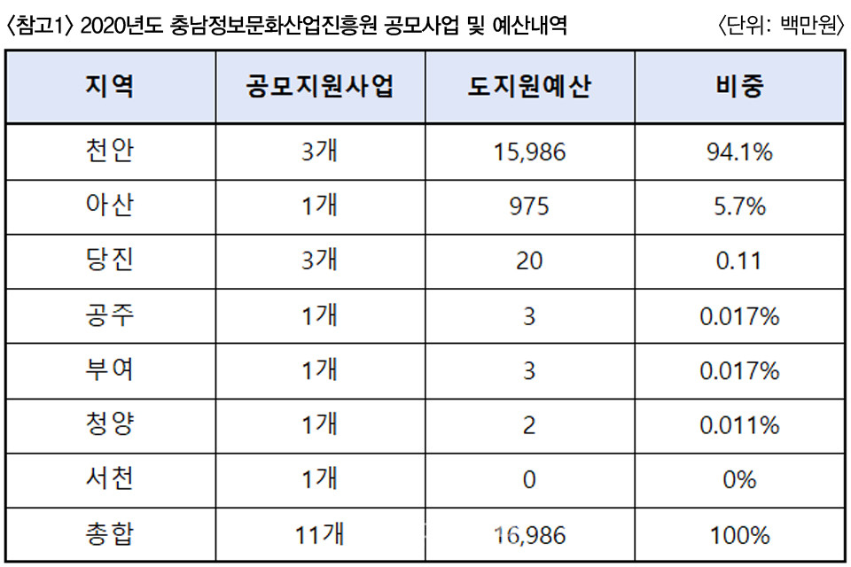 또한 “2020년도 공모사업 지역별현황을 보면 총 11개 공모사업 중 천안과 아산의 사업 4건에 공모사업 예산의 99%를 배정하여 이 역시 부익부빈익빈 현상을 보는 것 같다”고 지적하고 “1% vs 99%가 맞는 말인 것 같다”고 강조했다(<참고 1> 참조).