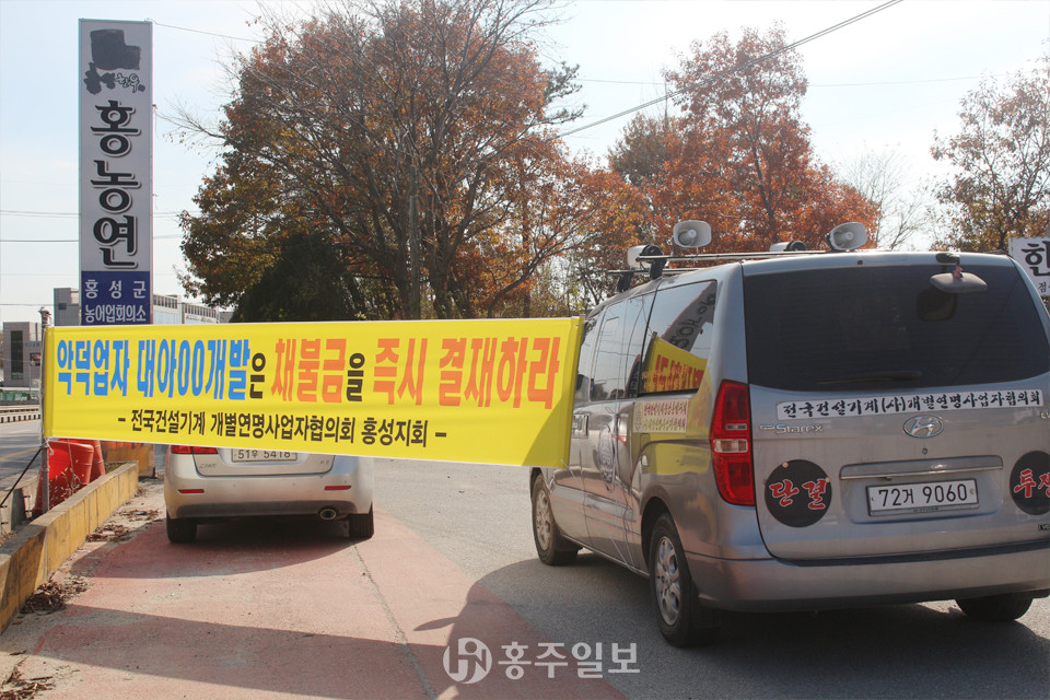 지난 9일 홍농연 회관 앞에 ‘악덕업자 00개발은 체불금을 즉시 결제하라’라는 내용의 현수막이 내걸렸다.<사진>