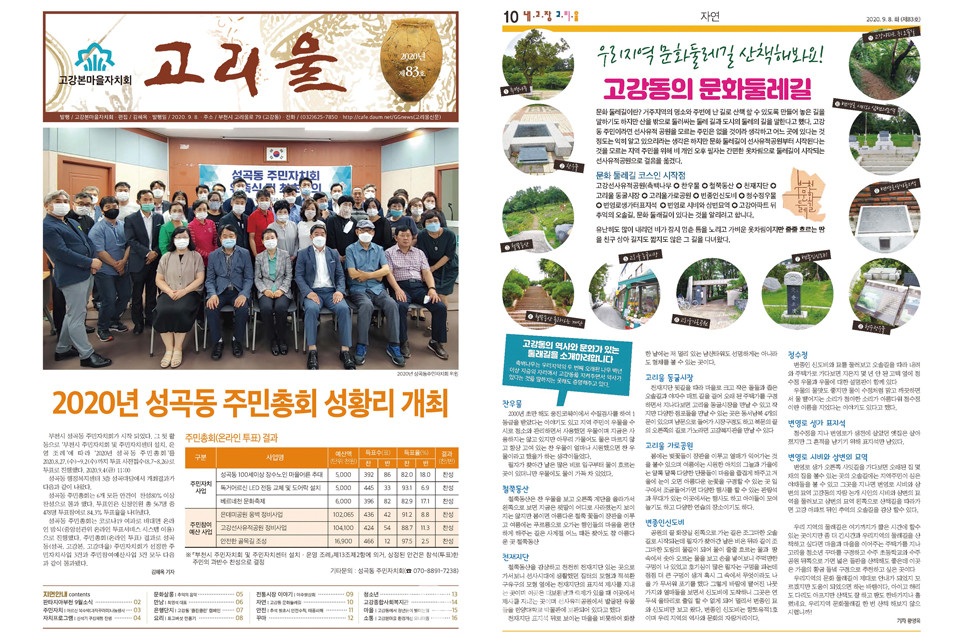 이러한 주민들의 소통의 창구인 부천시 오정구 고강본동의 지역소식지인 고리울신문 제83호가 지난 9월 8일 발행됐다. 제83호 1면에는 ‘2020년 주민총회’소식을 싣고 있다. 동네소식, 자치회소식, 자치프로그램, ‘음악의 위안이 필요한 요즈음’이라는 문화살롱, 6면에는 ‘고강동 자율방제단은 이렇게 활동해요’란 기사를, 7면에는 은행단지 ‘클린클린’ 캠페인을, 표고버섯 깐풍기 만들기란 요리법 기사와 고리울동굴시장 여주쌀상회 소식도 실렸다.