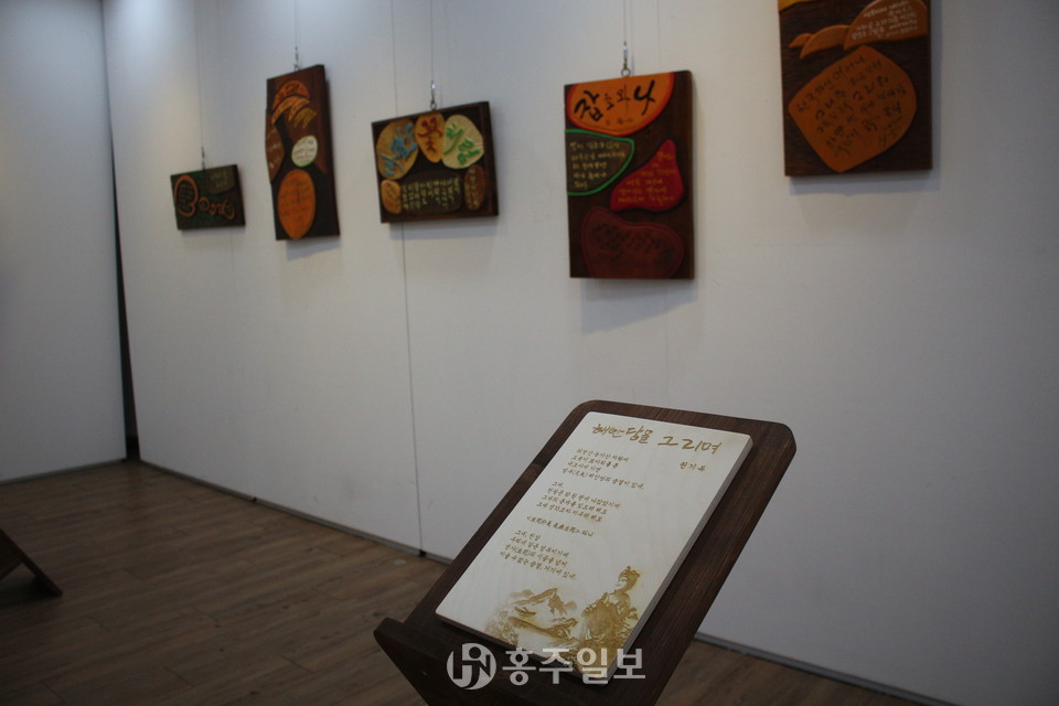 이날 시화전엔 지난달 29일 용봉사 등산로 숲속 시화전의 출품작들과 더불어 문인협회 회원들의 시화 작품을 보광서각회(회장 김광수)와 협력해 서각형식으로 제작한 작품들을 선보였으며 전시회는 오는 22일까지 열릴 예정이다.