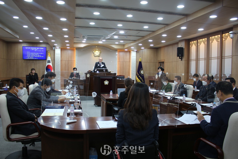이날 정례회는 제1차 본회의로, 의사보고, 5분 자유발언 후 △제274회 홍성군의회 제2차 정례회 회기 결정의 건 △제274회 홍성군의회 제2차 정례회 회의록 서명의원 선임의 건 △2020년도 군정업무 추진실적 및 2021년도 주요 업무계획 보고 청취의 건 △2021년도 예산안 및 기금운용 계획안 제안 설명의 건을 상정하고 김석환 군수의 군정연설, 김승환 기획감사담당관의 제안 설명 이후 예산결산특별위원회 구성의 건을 상정한 뒤 마쳤다.