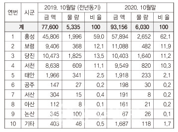 홍성군, 도내 62.1% 차지… 전년 동기 26.4% 상승