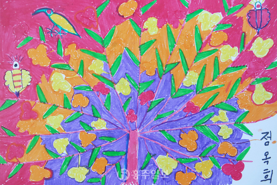정옥희 할머니는 꽃을 많이 그리십니다. ‘무슨 꽃이에요?’ 하고 여쭈어보면 ‘물러! 기냥 그렸어!’ 하고 눙치십니다. 아마도 한창 때 보았던 마음속의 꽃일 것입니다. 새도 자주 그리십니다. 공작새, 파랑새와 같이 환상적인 새를 그리시는데 새들은 서로 마주 보거나 나란히 서 있습니다. 색채도 표정도 행복해 보이는 걸 보면 정옥희 할머니도 행복한 분이라는 생각이 듭니다. 정옥희 할머니의 〈봉숭아〉 그림은 마치 공작새가 꼬리를 활짝 편 것처럼 그리셨습니다. 벌, 나비가 한 마리씩 있고 새도 한 마리 있습니다. 남색, 진분홍, 주황, 연두색이 어울려 기분을 좋게 합니다. 정옥희 할머니는 분홍색, 하늘색, 연두와 같이 밝은 색을 주로 쓰시는데 우연 같지만은 않고 할머니 마음의 반영일 거라는 생각이 듭니다. 〈봉숭아〉 또한 실재 봉숭아를 보고 그리셨기 보다는 할머니 마음속 영상을 따라 그리신 것 같습니다.