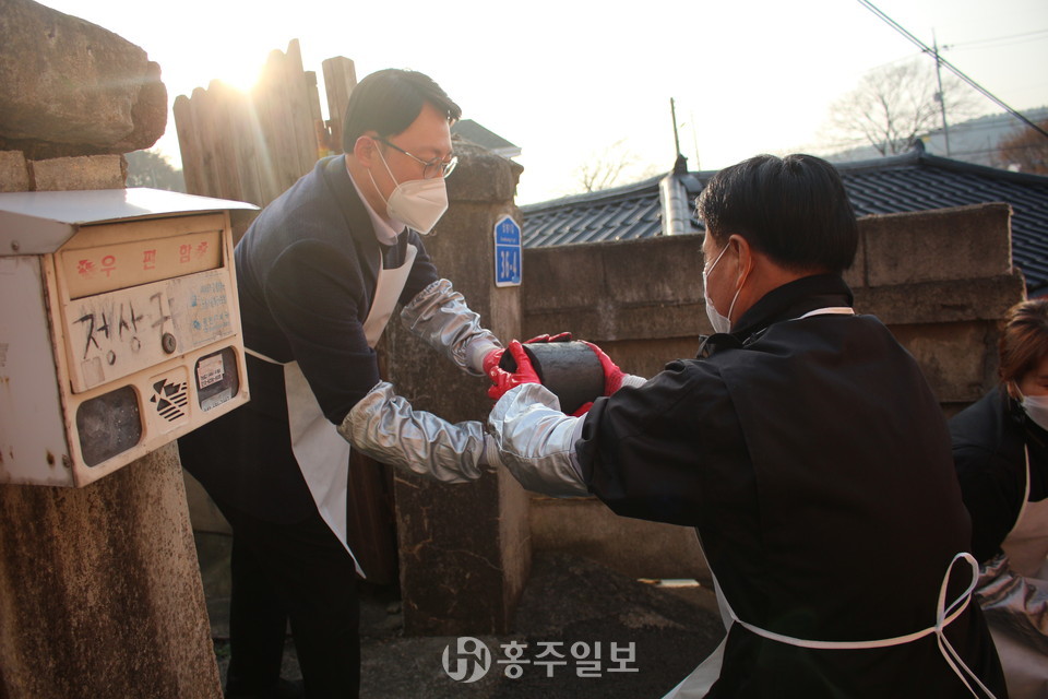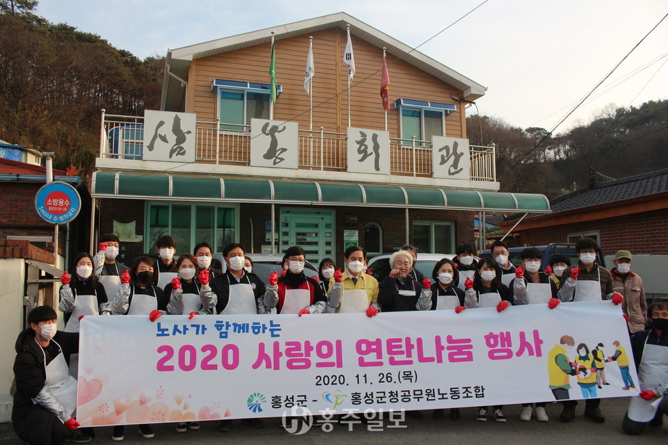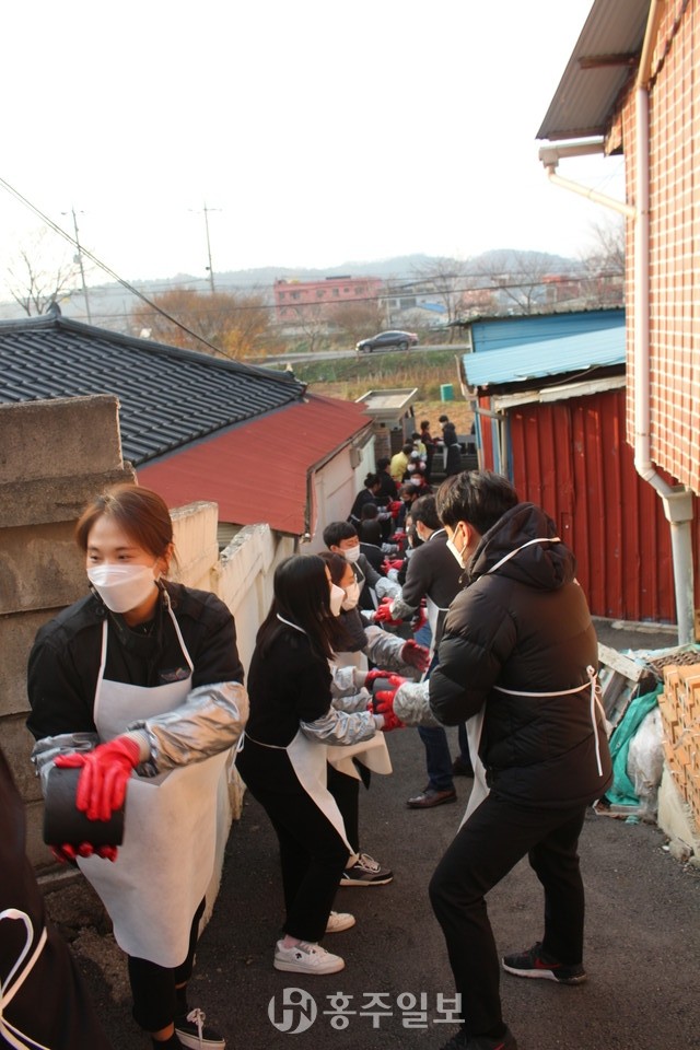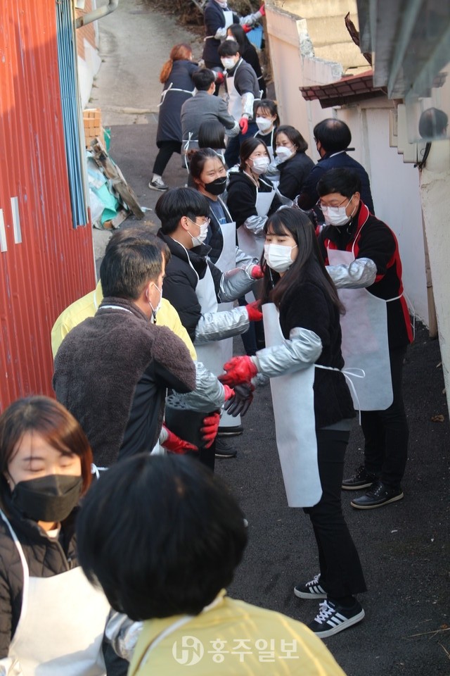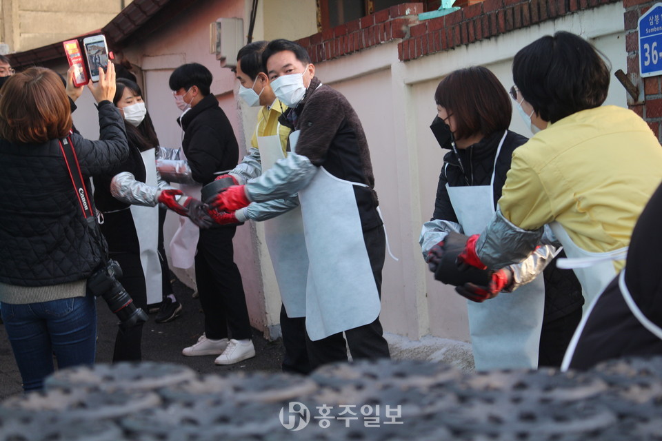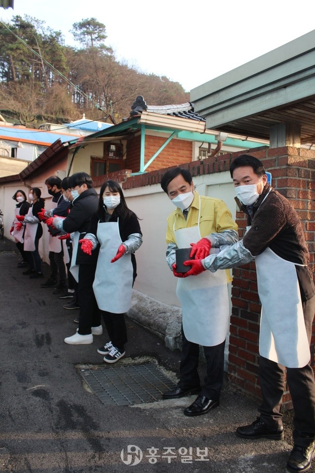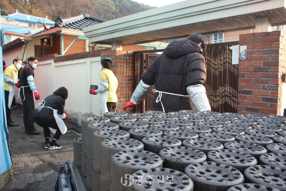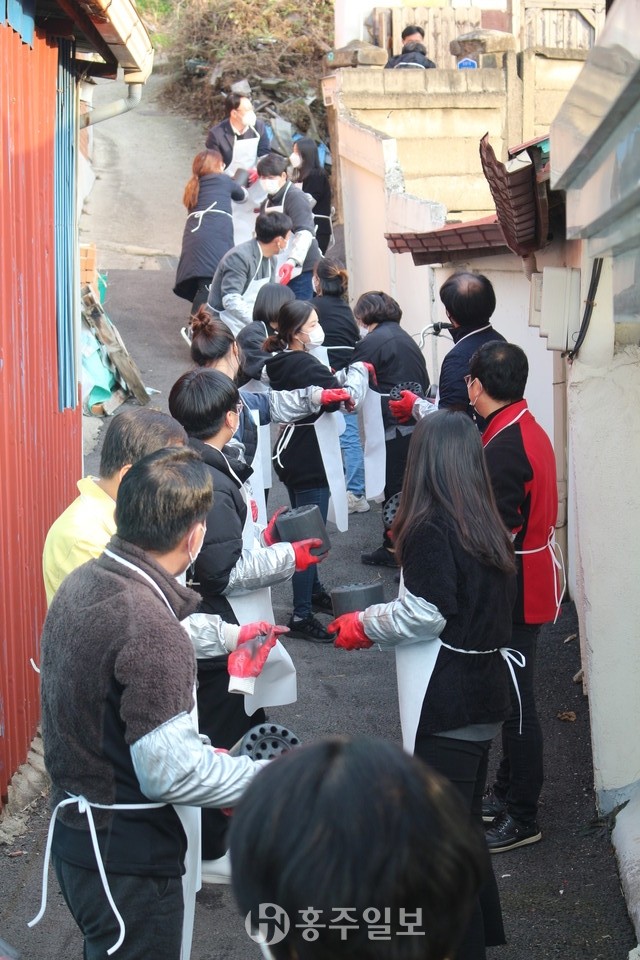 지난 26일 오후 4시 광천읍 광천리 삼봉마을에서 홍성군청공무원노동조합(위원장 국응서)이 주최한 사랑의 연탄배달봉사활동이 진행됐다.