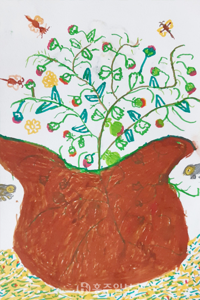 이연복 할머니는 그 다음 날에도 시원하게 그림을 그리지는 않으셨습니다. 흥미를 잃지나 않으실지 내심 걱정이 되었습니다. 괜한 걱정이었다는 것을 다음날 일깨워 주셨습니다. 그림을 두 장이나 그려 오셨는데 이전과는 완전히 다른 그림이었습니다. 한 장은 화분을 그린 그림이었고 또 한 장은 해바라기를 그린 그림이었습니다. 두 장 모두 선이 시원하고 채색이 조밀하면서 생생하였습니다.