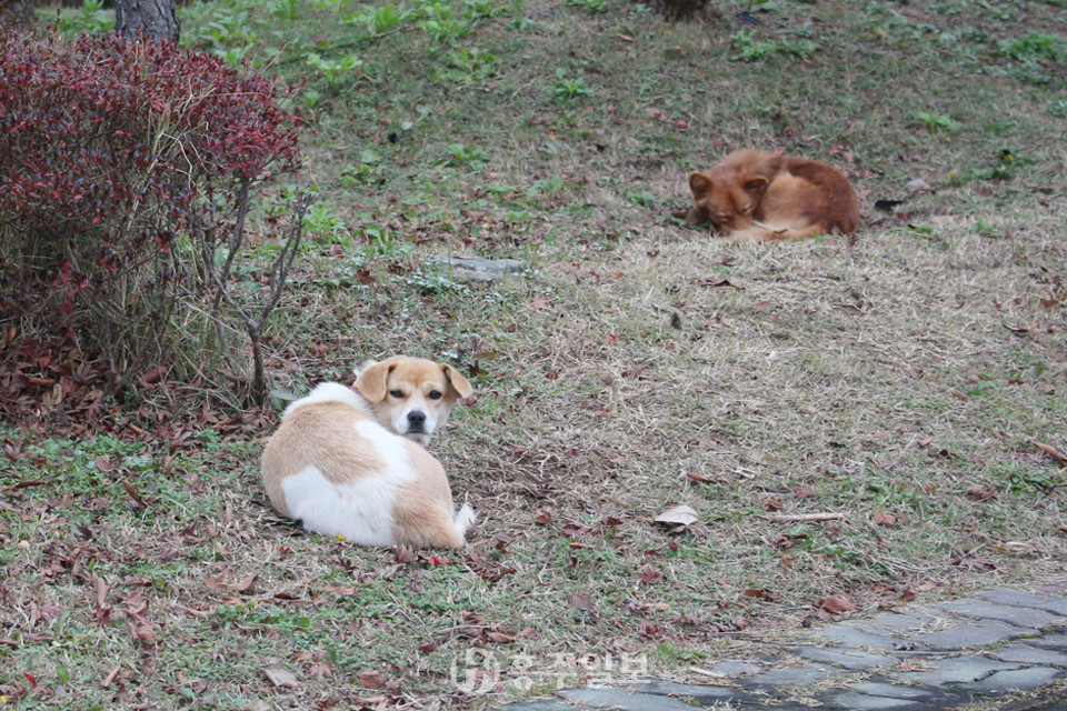 지난달 20일, 청운대학교 입구에서 두 마리의 개가 누워 태연하게 기자를 바라보고 있다. 전면에 있는 개는 인근 카페 ‘슬로우 잇 다운(대표 김성식)’에서 기르고 있으나, 후면에 있는 개는 초면인 개다.