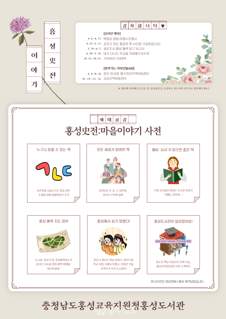 충청남도홍성교육지원청홍성도서관(관장 윤민경)은 지난 1일 세대공감 마을사 편찬 사업으로 추진한 ‘홍성史전:마을이야기 사전’을 발간했다고 밝혔다.