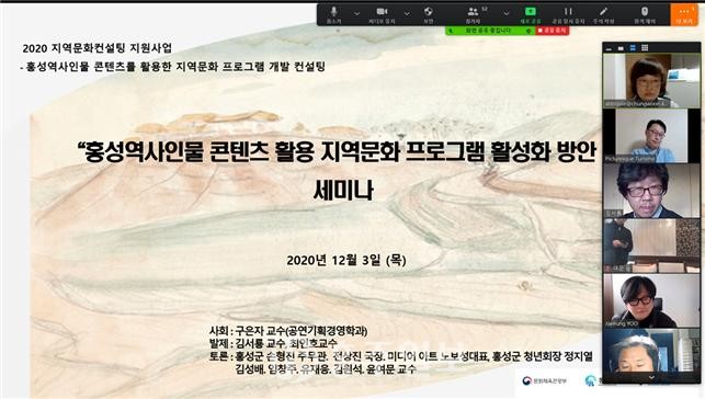 역사인물 콘텐츠 활용 지역문화 프로그램 개발의 대상인 홍성 역사인물 중 고암 이응노 관련 콘텐츠 개발 방향과 결과에 대한 사회자의 구체적인 설명에 이어 청운대학교 김서룡 공연기획경영학과 교수의 ‘지역문화콘텐츠 프로그램 개발 및 발전 방향’과 최인호 관광경영학과 교수의 ‘지역문화 콘텐츠를 활용한 지역문화관광’에 대한 주제발표와 참석자들 간 토론이 진행됐다.