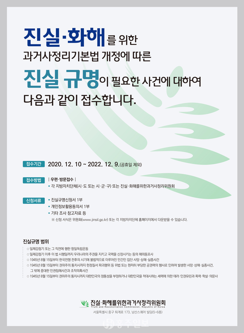 진실규명 신청기간은 10일부터 2022년 12월 9일까지 2년간이며 신청범위는 △일제강점기 또는 그 직전에 행한 항일독립운동 △ 일제강점기 이후 국력을 신장시킨 해외동포사 △ 한국전쟁 전후시기에 불법적으로 이뤄진 민간인 집단 사망·상해·실종사건 △ 광복이후 부당한 공권력 행사로 인한 중대한 인권침해사건과 대한민국을 적대시하는 세력에 의한 테러·폭력 사건 등이다.