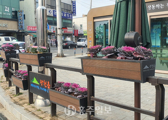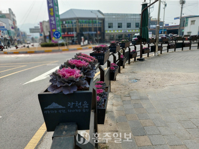 광천읍은 코로나19로 침체된 지역사회에광천읍 도로변에 식재된 꽃양배추.가지 도로변을 중심으로 꽃양배추 1500본을 식재했다.