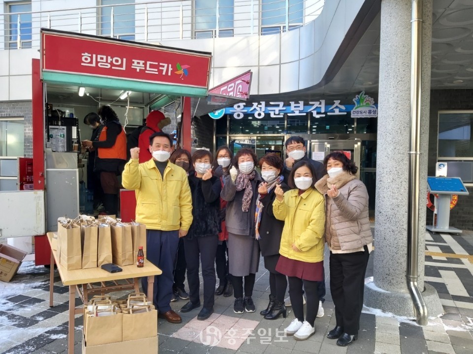 이날 협의체 직원들은 홍성군 보건소(소장 조용희)를 방문해 140만 원 상당의 샌드위치, 커피, 미니누룽지 등으로 구성된 간식 세트를 전달했다.