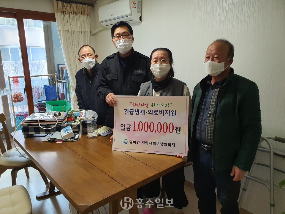 홍성군 금마면지역사회보장협의체(공공위원장 한광윤·민간위원장 이장호)는 22일 ‘희망나눔 위기가정’ 긴급지원 사업을 통해 위기상황에 놓인 3가구에 긴급구호비를 지원했다.
