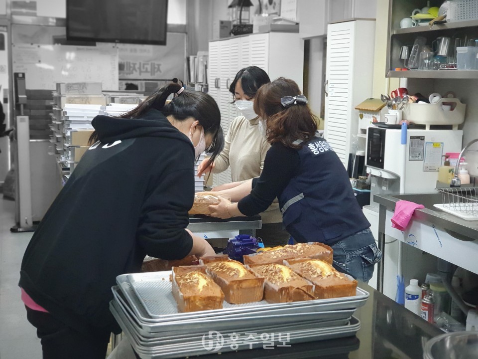 코로나19 방역수칙을 철저히 준수하며 진행된 이번 활동은 10명 이하로 봉사자를 모집해 지난 21일부터 23일까지 손으로만드는향기로운행복 봉사단(이하 손향기), 홍성읍여성자율방범대, 말끄미정리수납봉사단원의 참여로 홍주제과제빵학원에서 크리스마스 케익을 만들고 학생자원봉사자와 홍성군자원봉사거점캠프 활동가의 참여로 응원키트 포장이 이뤄졌다.