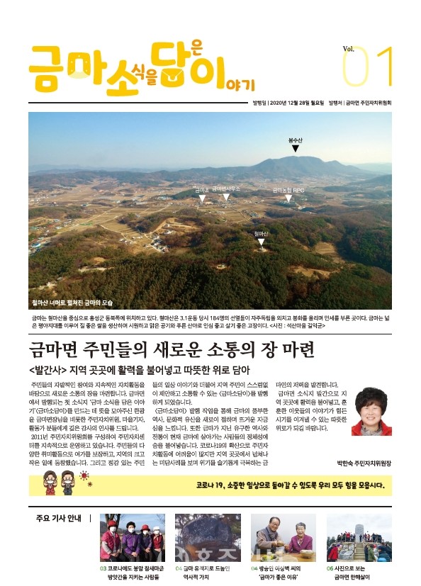 철마산과 봉수산을 품은 금마면의 전경이 표지를 장식하고 지난 1년 간 금마의 다양한 행사·활동 소식이 실린 소식지는 금마면 주민 1800여 세대와 재경금마면민회원에게 우편으로 발송될 예정이다.