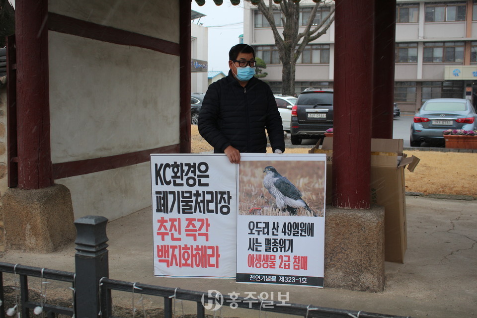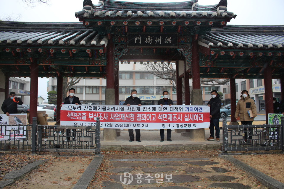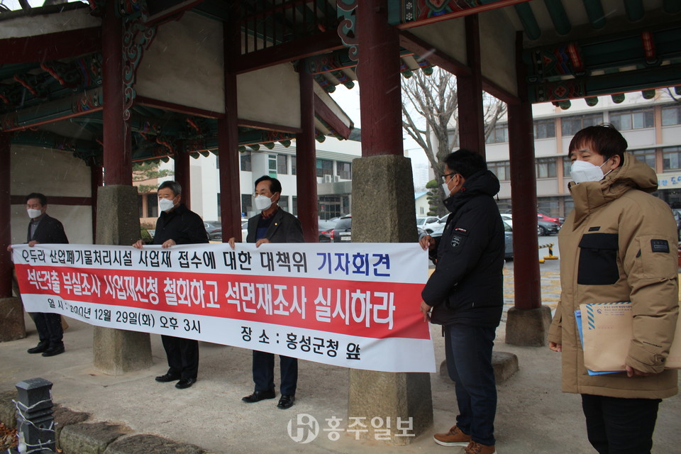 오두리산업폐기물처리장(이하 폐기물처리장)을 추진하던 KC환경개발㈜이 사업예정지에서 석면 미검출을 주장하며 지난 23일 사업을 재접수 함에 따라 홍성오두리폐기물처리장반대대책위원회(이하 대책위)는 지난 29일 군청 앞에서 기자회견을 실시했다.