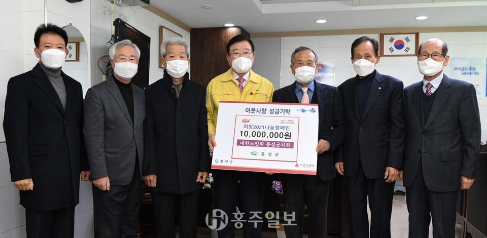 대한노인회 홍성군지회(회장 조화원)는 지난 30일 군청을 방문해 연말 불우이웃돕기에 써달라고 이웃돕기성금 1000만 원을 기탁했다.
