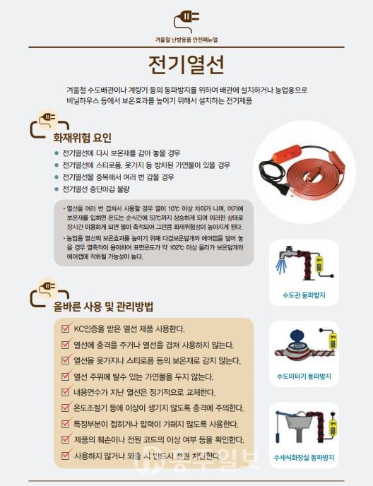 한성희 화재대책과장은 “열선을 사용할 경우 꼭 인증받은 제품을 사용하고, 노후된 열선은 교체해 줘야 화재를 예방할 수 있다”고 당부했다.