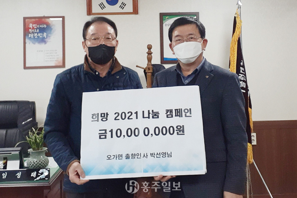예산군 소재 신성농장 박선웅 대표는 지난달 29일 오가면행정복지센터(면장 임성래)를 방문해 경기도에 거주하는 형 박선영 씨를 대리해 추운 겨울 소외된 이웃을 위해 써 달라며 2021 나눔 캠페인 이웃돕기 성금 1000만 원을 기탁했다.