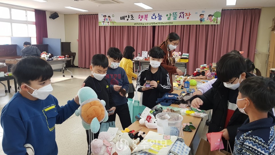 배양초등학교(교장 남경자)는 지난달 24일 교내 다목적실에서 ‘행복나눔 알뜰시장’을 열었다. 4~6학년 행복배양학생자치위원회 학생들은 다모임 회의를 통해 알뜰시장의 운영 방식과 불우이웃 돕기를 위한 성금 모금 방법을 정했으며, 코로나19 상황을 고려해 판매자 없이 구매자가 가격대로 돈을 내는 무인가게 방식으로 진행했다.