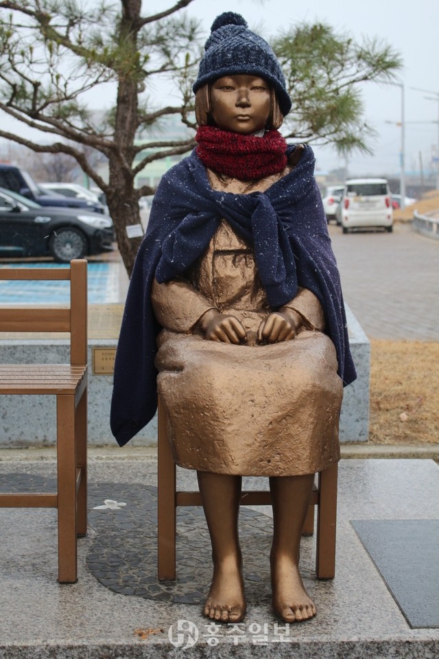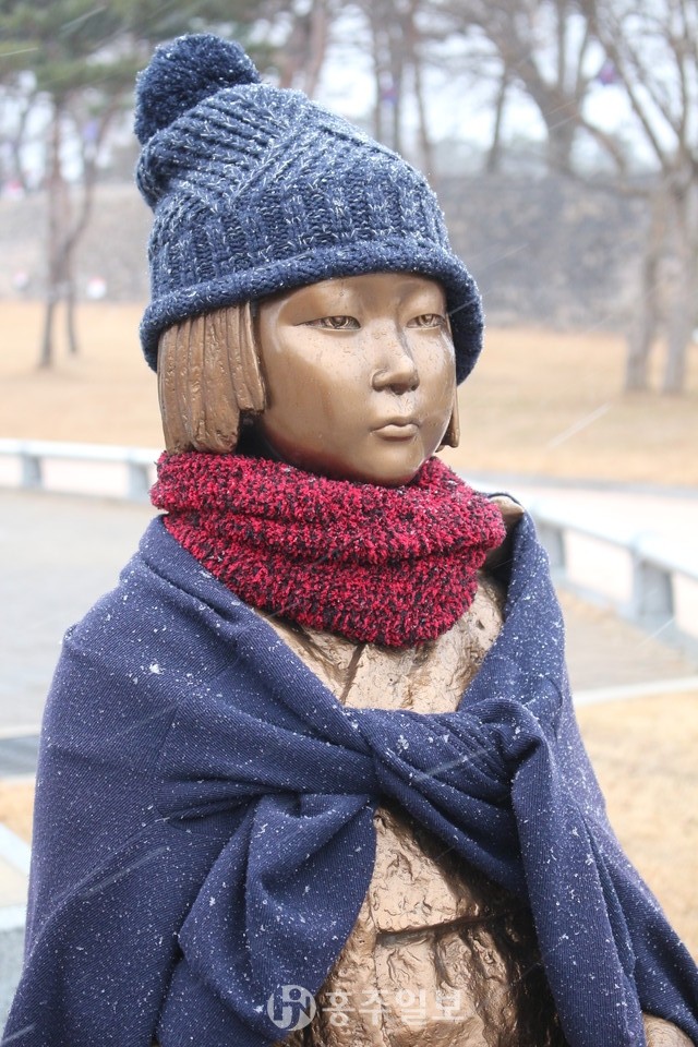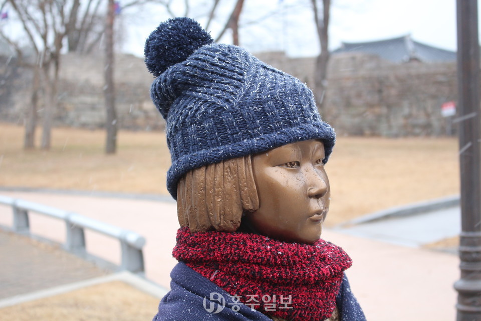 지난 1일 홍성군청 앞 소녀상이 겨울을 맞아 모자를 쓰고 목도리와 담요를 두른 채 내리는 눈을 맞고 있는 모습이다. 일본군 위안부의 피해를 상징하는 조형물인 ‘평화의 소녀상’은 지난 2017년 8월 15일 제72주년 광복절을 맞아 군민들이 건립추진위원회를 구성해 모은 후원금으로 홍주성 옆 공영주차장에 건립됐으며, 본 소녀상을 첫 건립한 곳은 2011년 서울 종로구 일본대사관 앞이다.