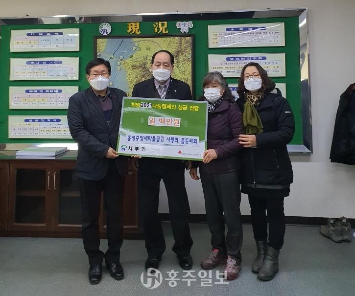 홍성중앙새마을금고 좀도리회(회장 김영순)에서 지난 12일 서부면(면장 고영대) 어려운 이웃을 위해 사용해 달라며 성금 100만 원을 기탁해 지역사회에 훈훈함을 전했다.