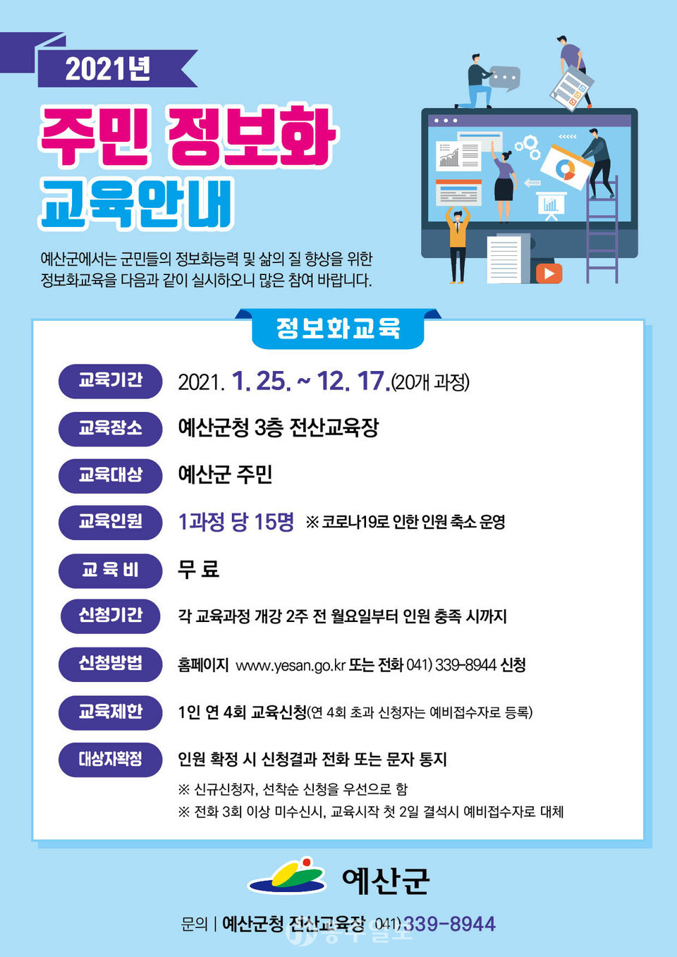 교육신청은 군청3층 전산교육장으로 전화신청(041-339-8944) 하거나 예산군청 누리집(www.yesan.go.kr)의 ‘컴퓨터 교육신청’메뉴에서 신청할 수 있다.