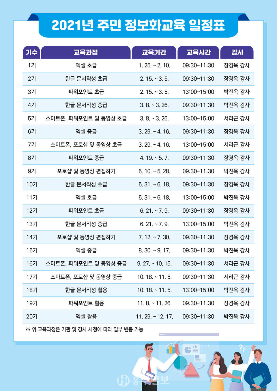 교육인원은 코로나19 사회적 거리두기에 따라 정원의 1/2로 축소해 과정별 15명씩이며, 교육비와 교재비는 무료다.