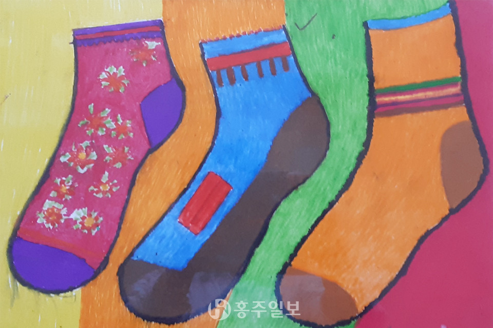 그림 〈양말〉도 생활에 꼭 필요한 물건을 그린 것입니다. 생활에 쓰이는 물건이 그림의 소재가 됐고 보고 관찰하며 따라 그렸는데 아름답고 감동적인 작품이 됐습니다. 색채가 밝고 명랑해 보고 있으면 즐거워집니다.