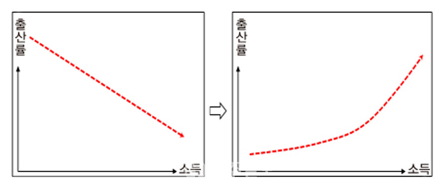 우리나라도 서민보다는 고소득 계층에 초점을 둬야 한다. 고소득 직종의 사람들이 결혼하고 아이를 낳고 행복하고 건강한 가정을 꾸리도록 해야 서민들도 결혼하고 아이를 많이 낳게 된다. 아래 그림과 같이 소득이 높을수록 출산율이 높아져야 서민들의 출산율도 상승하게 된다.