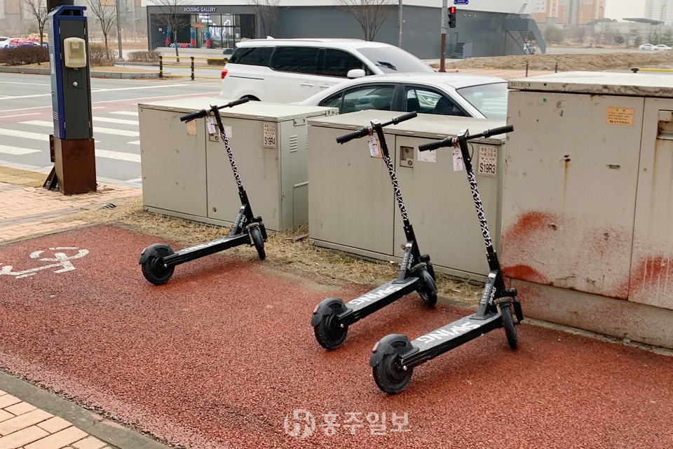 내포신도시 내에 비치된 공공이용가능 전동킥보드 ‘스윙’이 최근 이용률이 급증하면서 이에 따른 이용자들의 안전의식이 요구되고 있다.