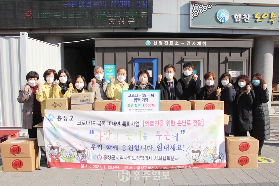 홍성군지역사회보장협의체 사회협력분과(공동위원장 이용환·분과장 윤일순)는 지난 20일 홍성군보건소(소장 이종천) 선별진료소 앞에서 군 보건소에 핫팩 1000개를 기탁했다.