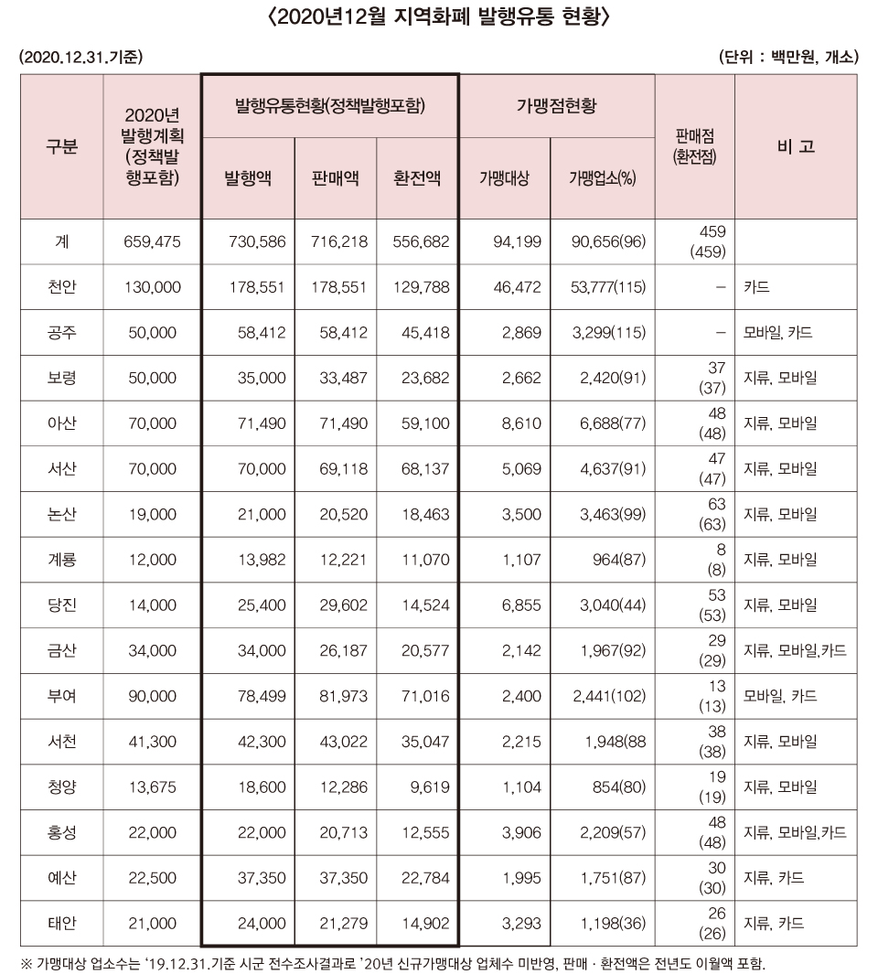 지난해 충남 지역화폐 발행액이 7300억 원을 넘어서며 도내에서 3조 원 이상의 경제효과를 올린 것으로 분석됐다. 또 가맹점 90% 이상은 지역화폐로 인한 매출 증가 효과를 본 것으로 나타났다.