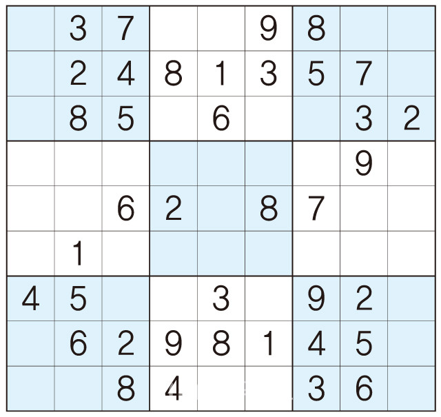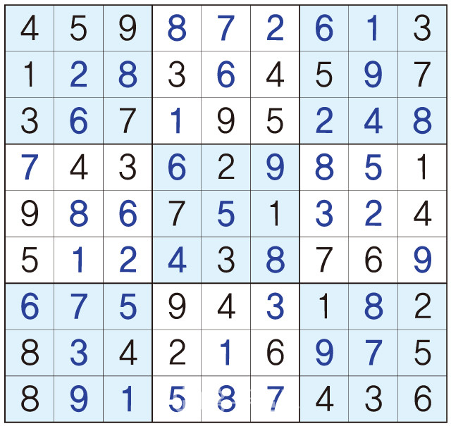3. 큰 정사각형(9x9) 안에 있는 작은 정사각형(3x3) 안에는 숫자 1~9가 각 한 번씩 들어간다.
