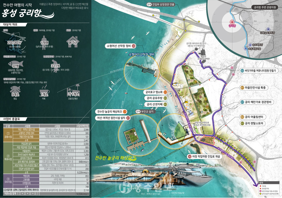 홍성군이 궁리항-어사항-남당항으로 이어지는 천수만 해안가 26Km를 체험과 힐링, 먹거리를 즐길 수 있도록 해양 레저 관광기반시설을 마련하고 어촌지역 소득기반을 조성하기 위해 2022년까지 1013억 원의 사업비를 투입한다.