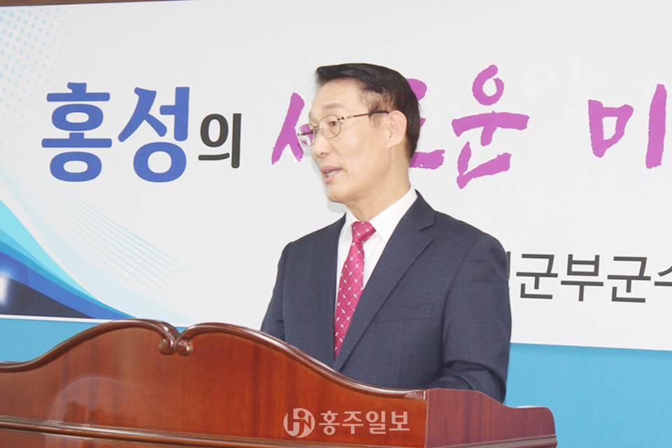 이용록 전 부군수가 지난 2일 홍성군 브리핑룸에서 “홍성의 새로운 미래를 열어가겠습니다”라는 주제로 기자회견을 열었다.