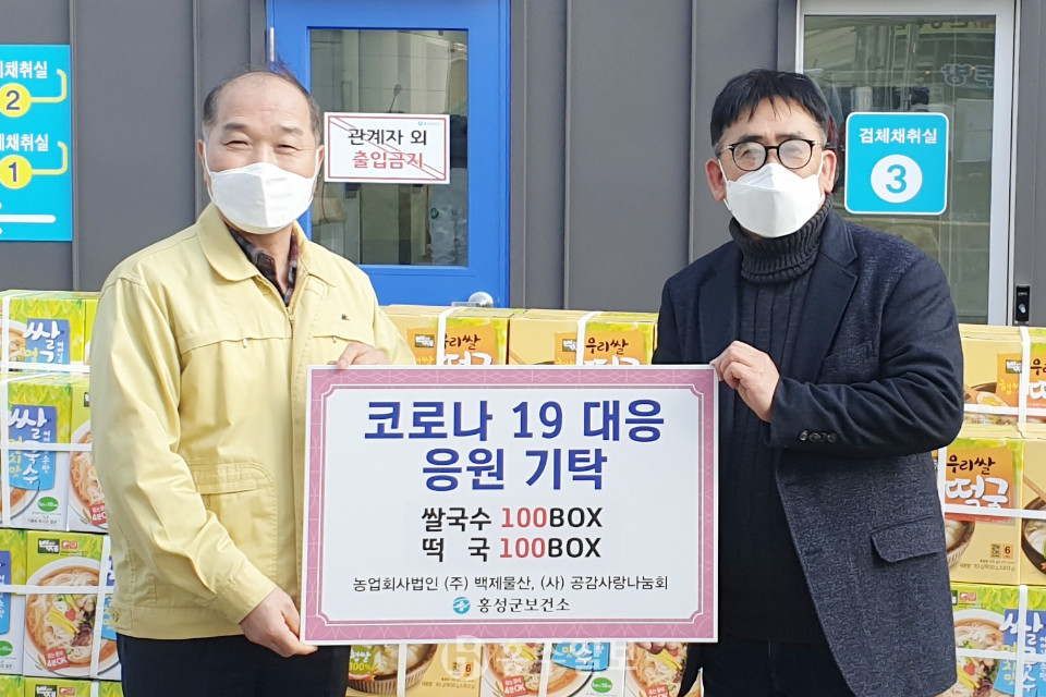 농업회사법인 백제물산(대표이사 김미순)과 공감사랑나눔회(대표이사 이필준)에서 지난 2일 쌀국수, 떡국 등 총 200박스의 후원물품을 홍성보건소에 전달했다. 후원받은 쌀국수와 떡국 등은 코로나19 대응과 확산방지를 위해 연일 근무로 고생하는 의료진과 근무자에게 제공할 예정이다.