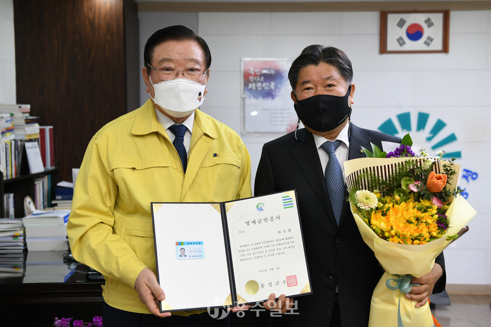 한편 홍성군은 타 지역에 거주하면서 군정발전에 직·간접적으로 도움을 주거나, 홍성군민들을 대상으로 각종 선행·봉사활동을 하는 자에게 그간의 공로를 격려하고 자긍심을 높이기 위해 명예 군민증을 수여하고 있다.