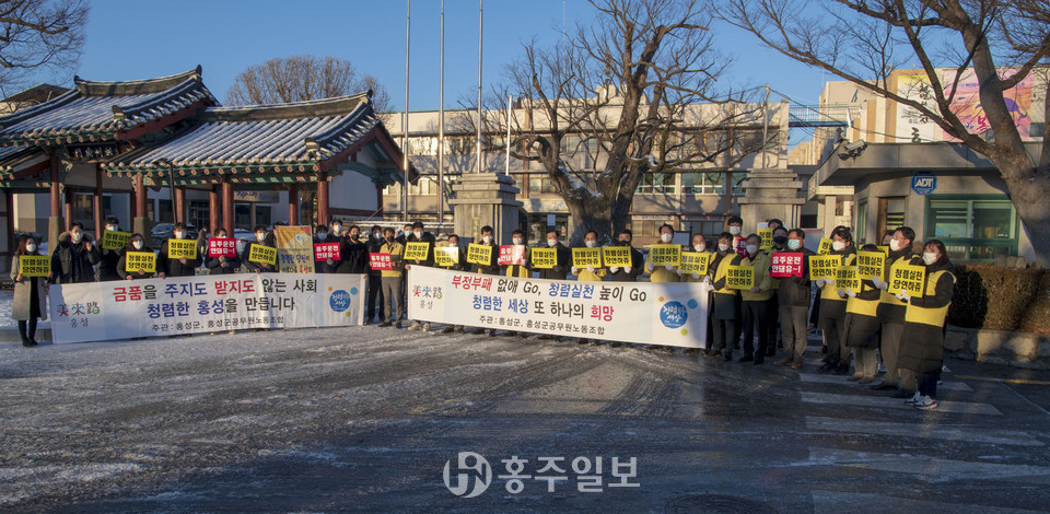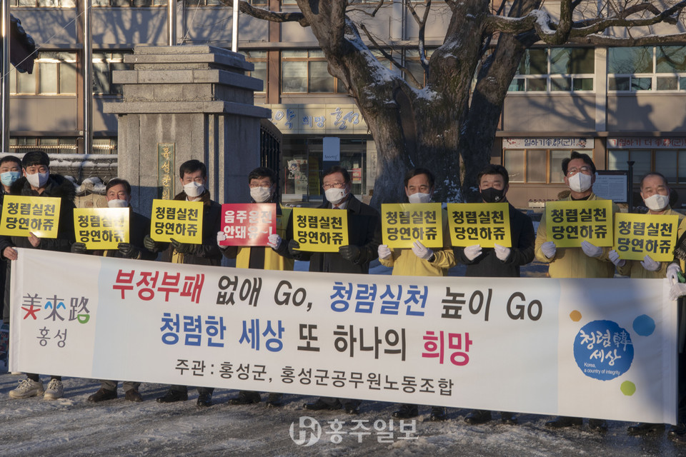 홍성군과 홍성군공무원노동조합은 설 명절을 앞두고 노사가 함께 청렴한 조직문화를 조성하고 군민에게 신뢰받는 깨끗한 홍성군을 만들고자 청렴 캠페인을 진행했다.<사진>