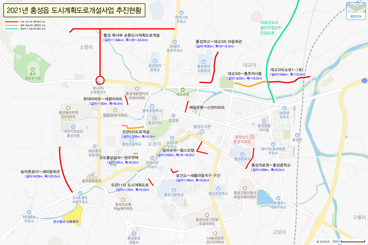 또한 지난 2018년부터 24억 원을 투입해 계속 추진 중인 홍성의료원~홍성중학교 구간, 동양양복점~우정오토바이 구간, 코오롱보일러~원우주택 구간 도시계획도로 3개 노선을 올해 말까지 완료할 예정이다. 올해 신규 사업으로는 옥암지구와 홍성경찰서 회전교차로를 연결하는 도로 등 5개 노선에 실시설계를 진행하고 도심 순환도로 구축을 통해 접근성을 강화하고자 한다.