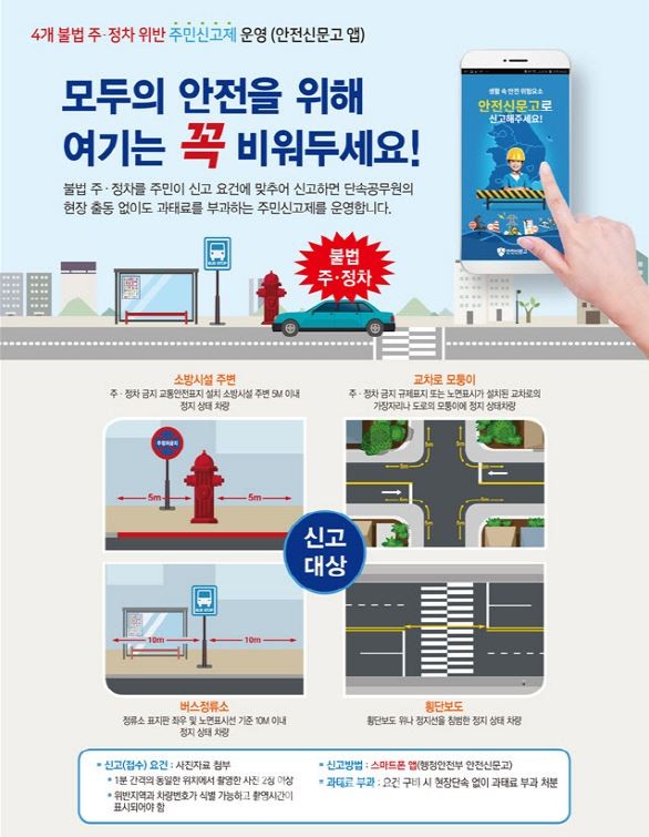‘안전신문고’ 앱은 일상생활에서 접하는 안전 취약 요인들에 대한 신고는 물론 처리 결과까지 자동으로 안내해주며 소화전 주변 불법 주정차를 포함한 ‘5대 불법 주정차’를 신고 할 수 있다.