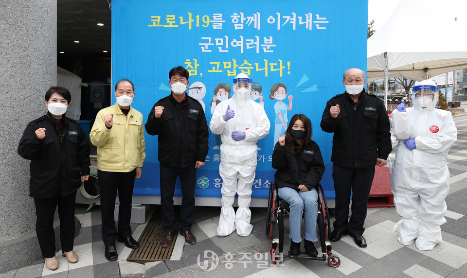 홍성군의회(의장 윤용관)는 설 명절을 맞아 전국최초 거점소독시설과 대인소독기를 활용한 코로나19 방역을 실시하고 있는 홍성군 거점소독시설 근로자를 찾아 격려하며 ‘안전한 설 명절 보내기 게릴라 캠페인’을 전개했다.