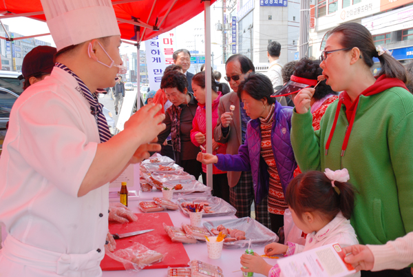 전국 제일의 축산군으로 이름난 홍성군에서 지역에서 생산된 돼지를 원료로 생산한 고품질 가열햄의 시식 및 판촉생사가 지난 16일 오전 10시부터 홍성읍 복개주차장에서 열렸다.