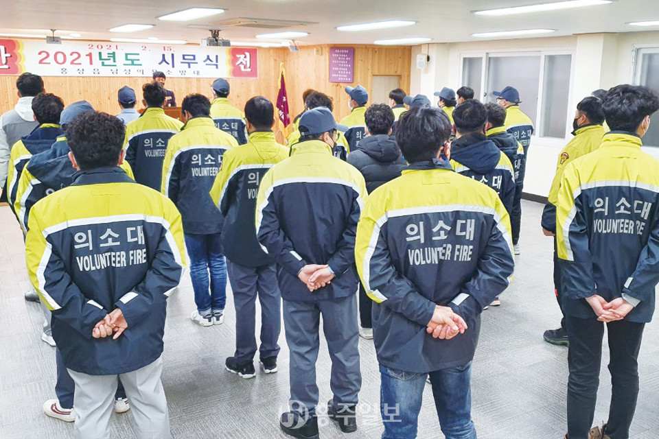 홍성읍남성의용소방대(대장 박성완)는 지난 15일 대사무실에서 대원 30여 명이 함께한 가운데 ‘2021년도 시무식 및 전역식’을 실시했다. 한편 홍성읍남성의용소방대는 △화재진압 업무지원 △읍내 시장 야간순찰 △공공이용시설 방역 등 다양한 활동을 이어오고 있다.