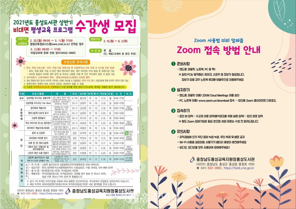 충청남도홍성교육지원청홍성도서관(관장 윤민경)은 오는 22일부터 다음달 2일까지 2021년도 상반기 비대면 평생교육 프로그램 수강생을 모집한다.