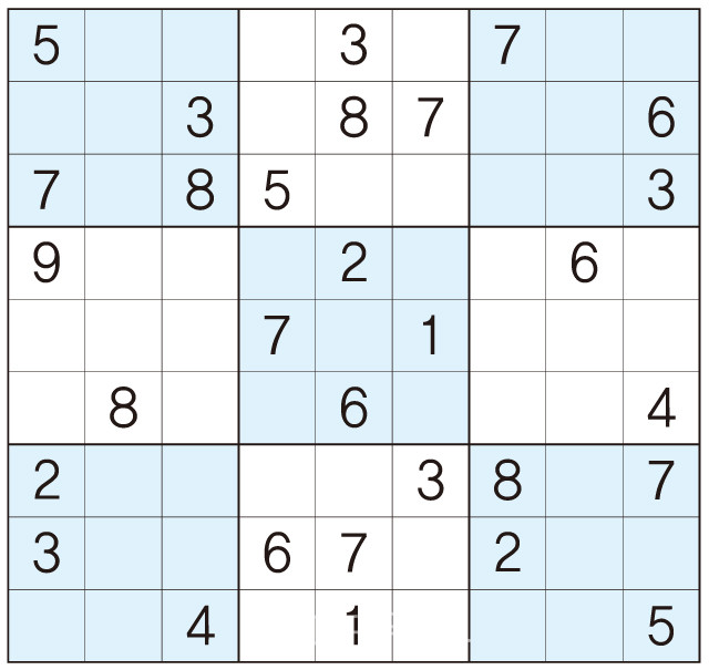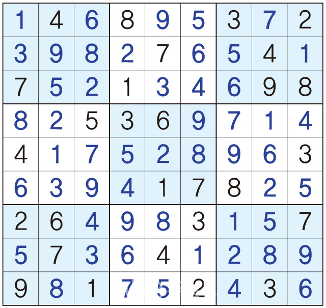 3. 큰 정사각형(9x9) 안에 있는 작은 정사각형(3x3) 안에는 숫자 1~9가 각 한 번씩 들어간다.
