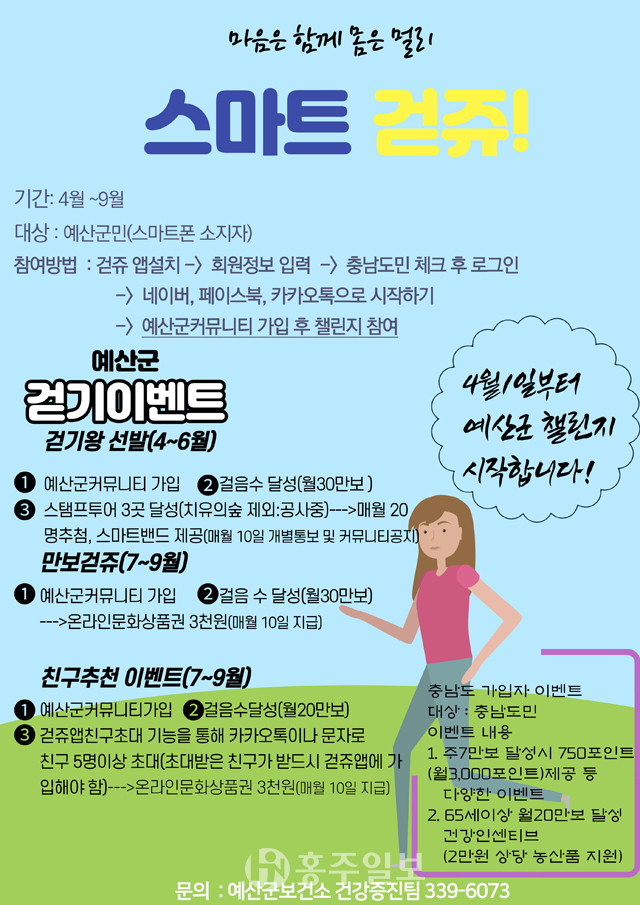 예산군보건소(소장 최승묵)는 군민 건강증진을 위한 ‘스마트 걷쥬’ 프로그램을 오는 4월 1일부터 재개한다.