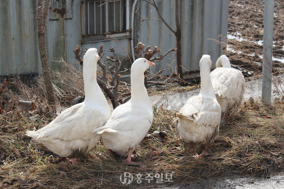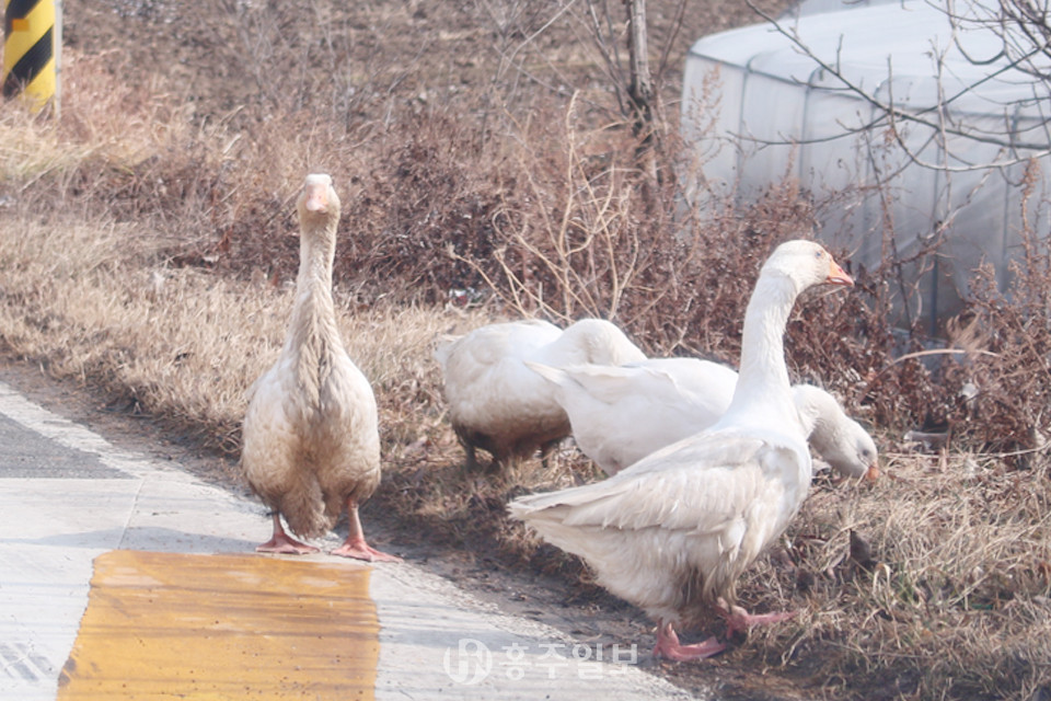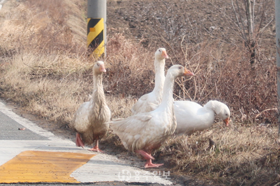지난 16일 홍북읍 삽교천 다리 인근에서 거위 4마리가 줄을 지어 차도를 행진하는 모습이 목격됐다. 거위 떼는 차도를 가로질러 근처의 민가를 향해 걸어갔다. 일반적으로 ‘집을 지키는 동물’이라 하면 보통 개를 떠올리는데, 거위 역시 집을 지키는 동물로 키우는 일이 빈번하다. 거위는 덩치도 크고 부리 안에 촘촘하고 날카로운 이빨이 나있는데다 지능이 높고 경계심이 강해 동서양을 막론하고 집을 지키는 역할을 부여하곤 했다.
