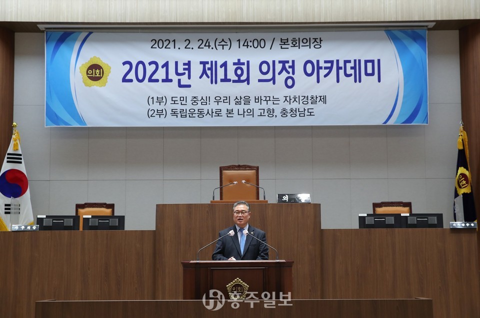 이날 도의회 본회의장에서 열린 제1회 의정 아카데미에선 중부대학교 황문규 경찰행정학과 교수가 강사로 참여해 자치경찰제 출범에 따른 변화와 개선방향을 소개했다. 이어 ‘역사저널 그날’의 패널로 유명한 심용환 강사가 강단에 올라 충남의 독립운동사를 심도 있게 조명하고 앞으로 나아가야 할 방향에 대해 참석자들과 의견을 교환했다.