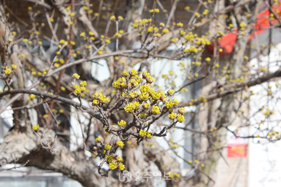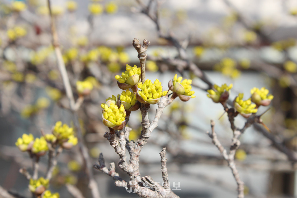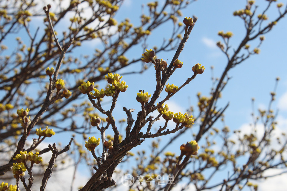 봄의 3번째 절기인 경칩(오는 5일)을 기대하며 지난 2일 홍양저수지 변의 산수유 나무가 샛노란 꽃봉오리를 내보였다.