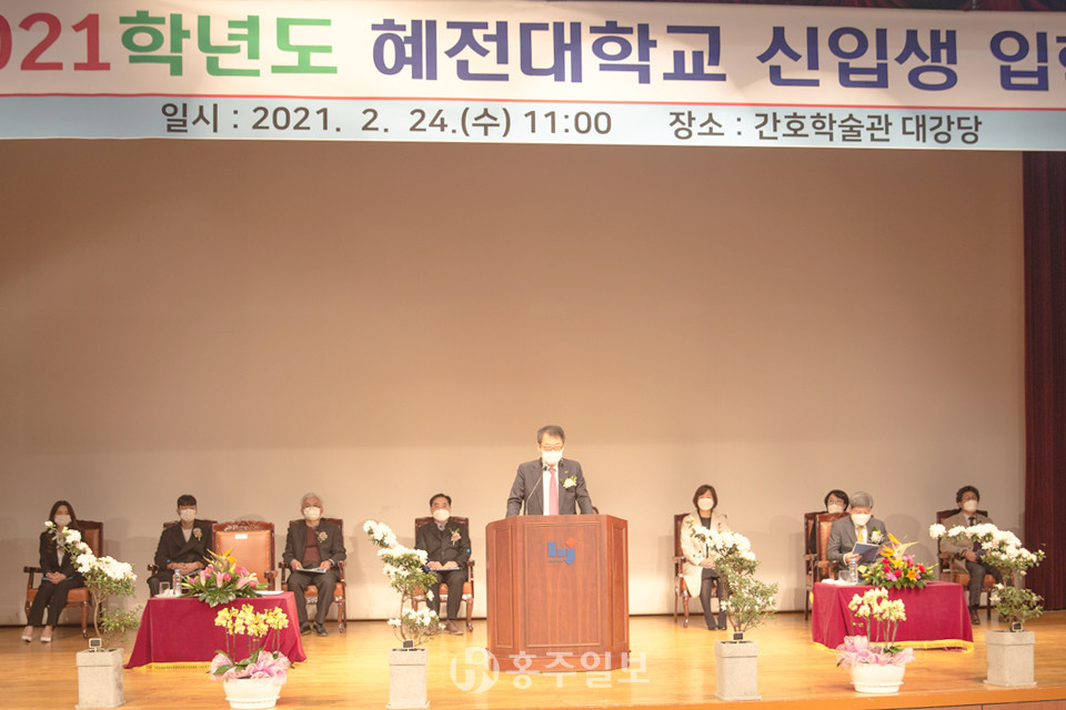 혜전대학교(총장 이세진)는 지난달 24일 간호학술관 대강당에서 이준호 혜전학원 이사장과 총장 등 보직교수와 학생대표 등 50여 명이 참석해 대면과 유튜브를 이용한 비대면으로 신입생 입학식을 개최했다. 신입생 중 입학성적 최우수자에게 수여하는 이사장상은 간호학과 김민서 학생, 총장상에는 학부별로 1명씩 5명의 학생이 받았다.